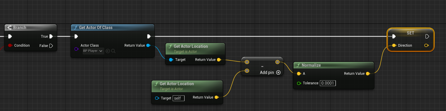 이후 다음과 같이 노드를 만들어 줍니다. Player와 Enemy위치의 차이를 Normalize한뒤 Direction으로 설정해줍니다.