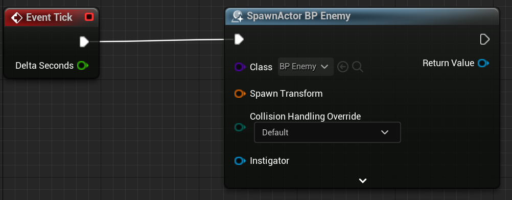 BP_EnemyFactory를 열어 이벤트그래프탭을 열어 다음과 같이 추가해주면 에너미는 실시간으로 생성되겠지만 Event Tick은 매프레인 실행되기때문에 화면은 적들로 가득차게 될것이다.
