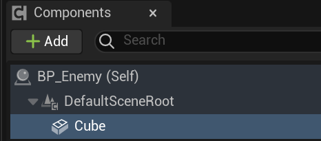 이제 적을 만들어 보겠다 블루프린트 폴더에 +Add후 블루프린트클래스/액터/ 이름 BP_Enemy로 블루프린트폴더에 저장한다. BP_Enemy열고 컴포넌트 +Add Cube를 추가해준다.
