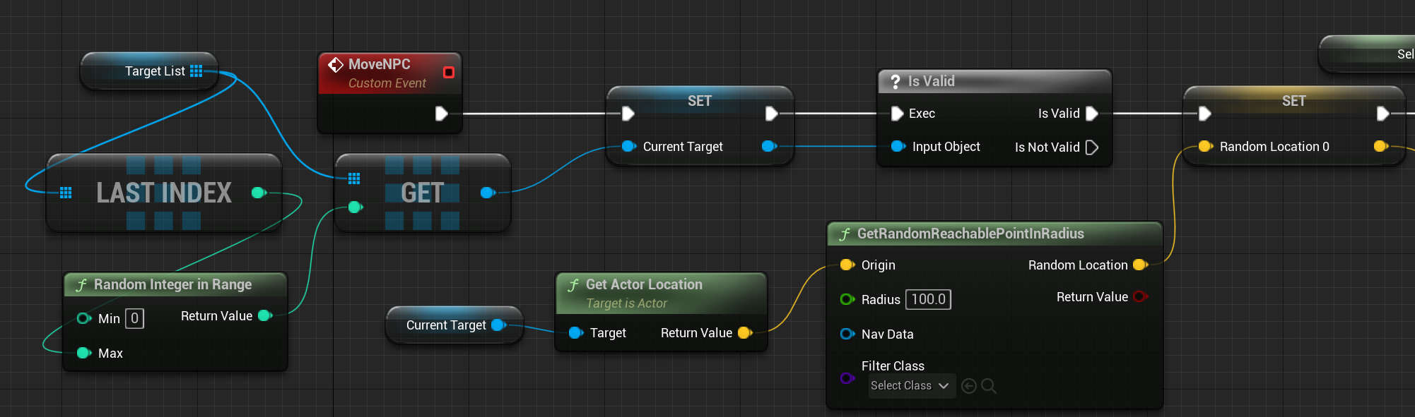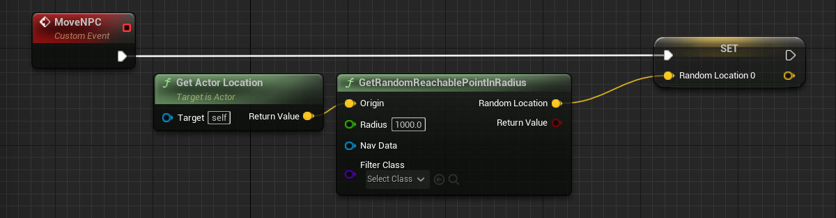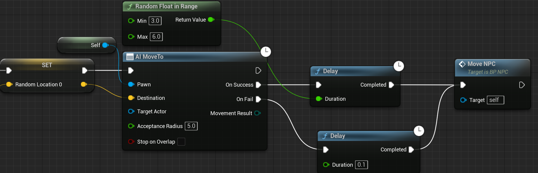 - 방금 만든 RandomLocation 노드에 MoveNPC 노드를 연결합니다.