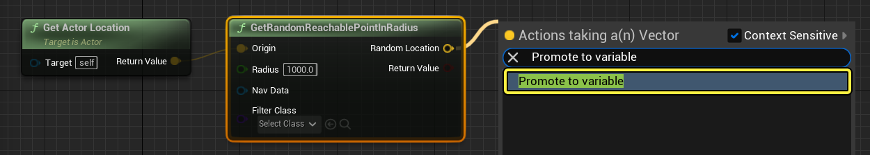 - GetRandomReachablePointInRadius 노드의 Random Location 핀을 드래그하여 변수로 승격(Promote to variable) 을 선택합니다.