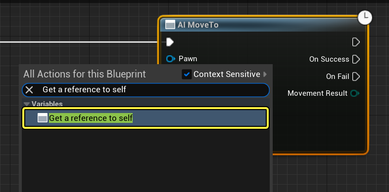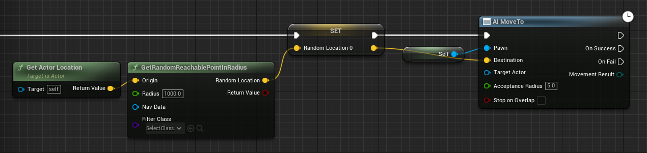 - Self 노드를 AI MoveTo 노드의 Pawn 핀에 연결합니다. 아래와 같이 Random Location 노드의 노란색 핀을 AI MoveTo 노드의 Destination 핀에 연결합니다.