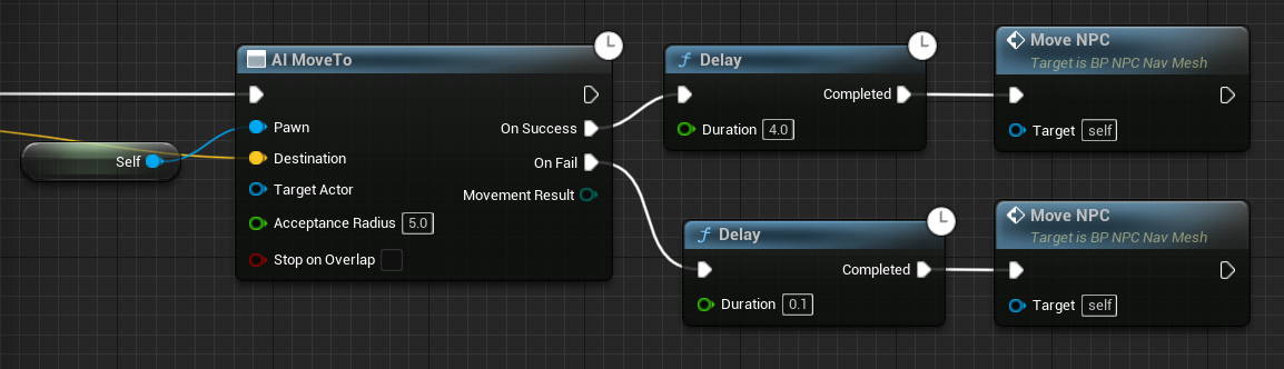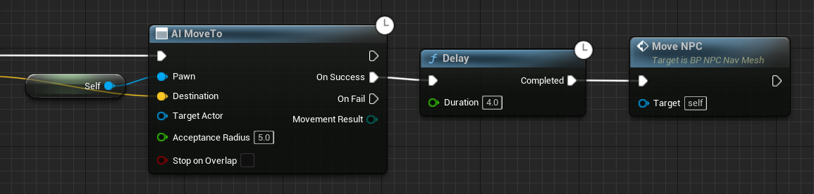 - AI MoveTo 노드의 On Success 핀에서 드래그하여 Delay 를 검색하고 선택합니다. Delay 노드의 Duration 을 4 로 설정합니다. 아래와 같이 Delay 노드의 Completed 핀에서 드래그하여 Move NPC 를 검색하고 선택합니다.