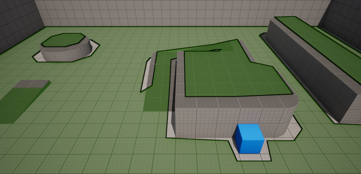 - 키보드로 P 를 누르면 레벨에서 내비게이션 메시를 시각화할 수 있습니다. 내비게이션 메시는 기본적으로 아래 이미지에서와 같이 녹색으로 시각화됩니다.