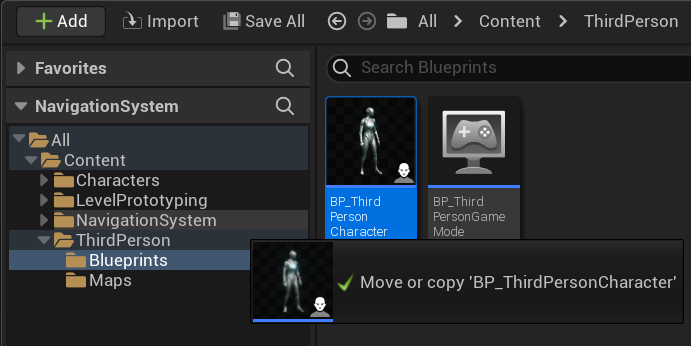 - 콘텐츠 드로어(Content Drawer) 에서 ThirdPersonBP > Blueprints 폴더로 이동하여 BP_ThirdPersonCharacter 블루프린트를 선택합니다. NavigationSystem 폴더로 드래그하고 여기에 복사(Copy Here) 옵션을 선택합니다.