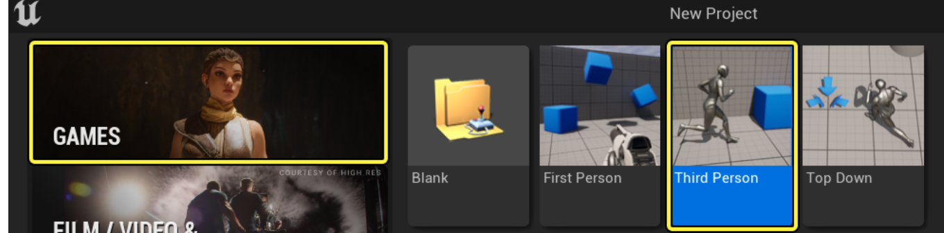 - 언리얼 프로젝트 브라우저(Unreal Project Browser)의 새 프로젝트 카테고리(New Project Categories) 섹션에서 게임(Games) 및 삼인칭(Third Person) 템플릿을 선택합니다.