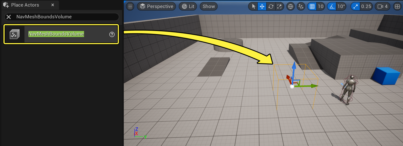 - 프로젝트의 디폴트 ThirdPersonExampleMap 에서 액터 배치(Place Actors) 패널로 가서 NavMeshBoundsVolume 을 검색하고 레벨로 드래그합니다.