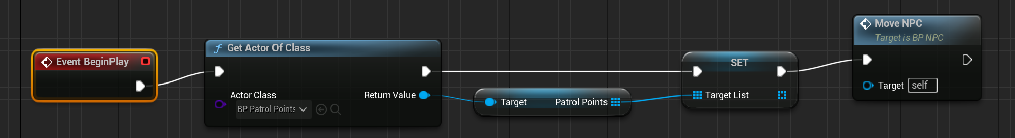 BP_NPC에 기둥들을 찾에 BP_Patrol 변수에 저장하는 로직을 넣습니다.