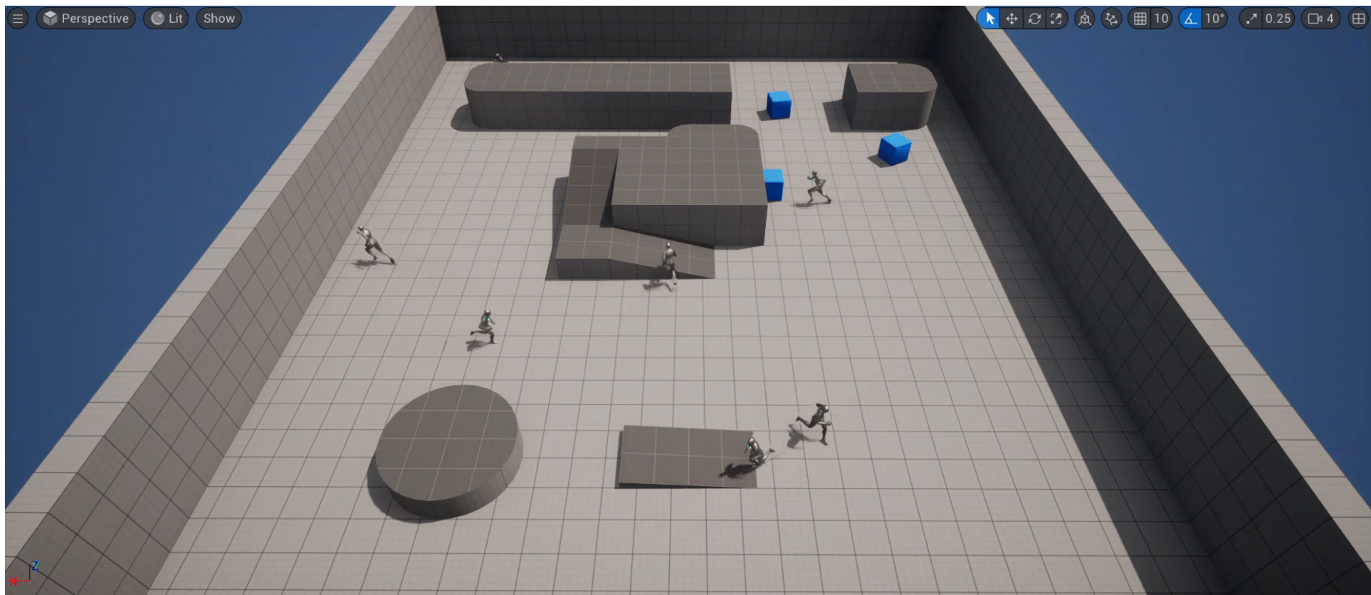 - BP_NPC_NavMesh 블루프린트를 레벨로 드래그하고 시뮬레이트(Simulate) 를 클릭합니다. 에이전트가 레벨에서 돌아다니는 것을 볼 수 있습니다.