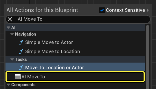 - 이벤트 그래프(Event Graph) 를 우클릭한 뒤 AI MoveTo 를 검색하고 선택합니다. RandomLocation 노드를 AI MoveTo 노드에 연결합니다.