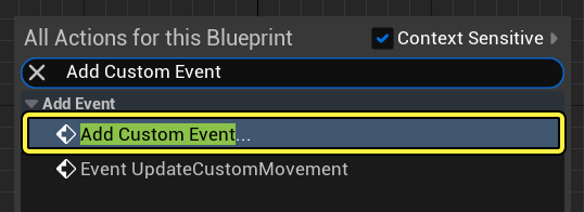 - 이벤트 그래프 를 우클릭한 뒤 커스텀 이벤트 추가(Add Custom Event) 를 검색하고 선택합니다. 이벤트를 MoveNPC 로 명명합니다.