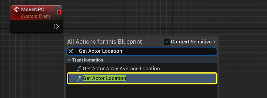 - 이벤트 그래프 를 우클릭한 뒤 Get Actor Location 을 검색하고 선택합니다.