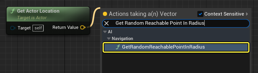 - GetActorLocation 노드에서 드래그하여 GetRandomReachablePointInRadius 를 검색하고 선택합니다. Radius 를 1,000유닛으로 설정합니다.