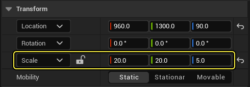 - NavMeshBoundsVolume 을 선택한 채 디테일(Details) 패널에서 볼륨의 스케일을 X = 20, Y = 20, Z = 5로 조절합니다. 아래와 같이 볼륨을 움직여서 플레이 영역 전체를 덮게 합니다.