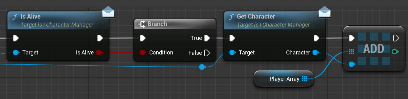 인터페이스 IsAlive를 통해 Output을 받아 살았으면 GetCharacter로 바꿔 PlayerArray에 Add한다.