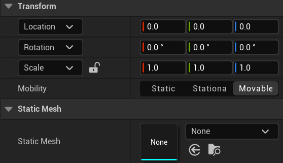 이제 스태틱메시가 추가되었고 트랜스폼도 보이지만 아직도 아무것도 보이지 않습니다. 컴포넌트만 추가했지 메시데이터는 추가하지 않았기 때문입니다. Transform밑에 Static Mesh컴포넌트 None을 클릭해 Cube를 추가해 보겠습니다.