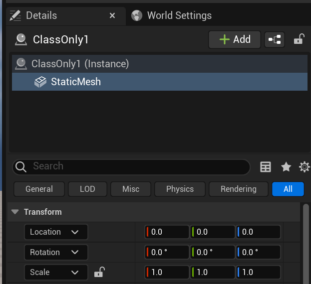 5. 언리얼 레벨에디터로 돌아가 C++>Inflearn폴더의 ClassOnly클래스를 끌어다 뷰포트에 놓으면 다음과 같이 작은 기즈모만 보입니다. 우리가 만든 클래스에는 아직 메시가 없기 때문입니다. 따라서 트랜스폼도 보이지 않습니다. ClassOnly1옆의 +Add를 클릭해 컴포넌트를 추가해 보겟습니다.