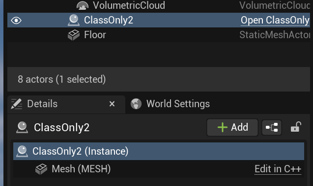 아웃라이너에서 ClassOnly클래스를 끌어 새로 배치해줍니다. 이번 인스턴스는 Mesh컴포넌트가 이미 추가되어 있고 트랜스폼도 보이지만 여전해 메시데이터가 있지 않습니다.