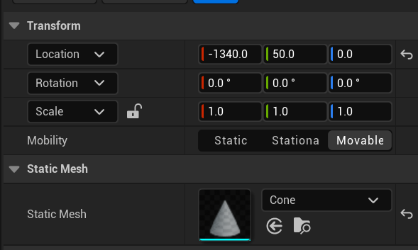 StaticMesh에 Cone을 설정해주면 뷰포트에 콘이 보입니다. Location 이 엉망이지만 Begine()에서 다시 설정할것이므로 신경쓰지 않써도 됩니다.