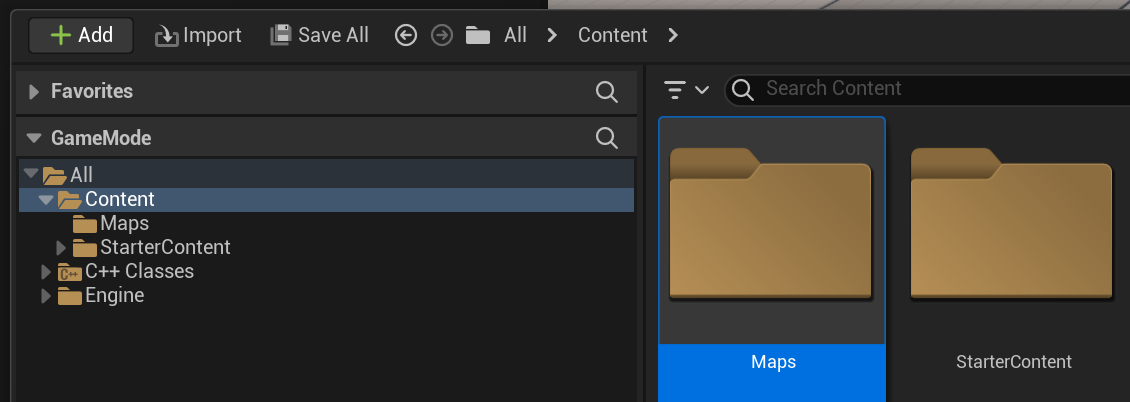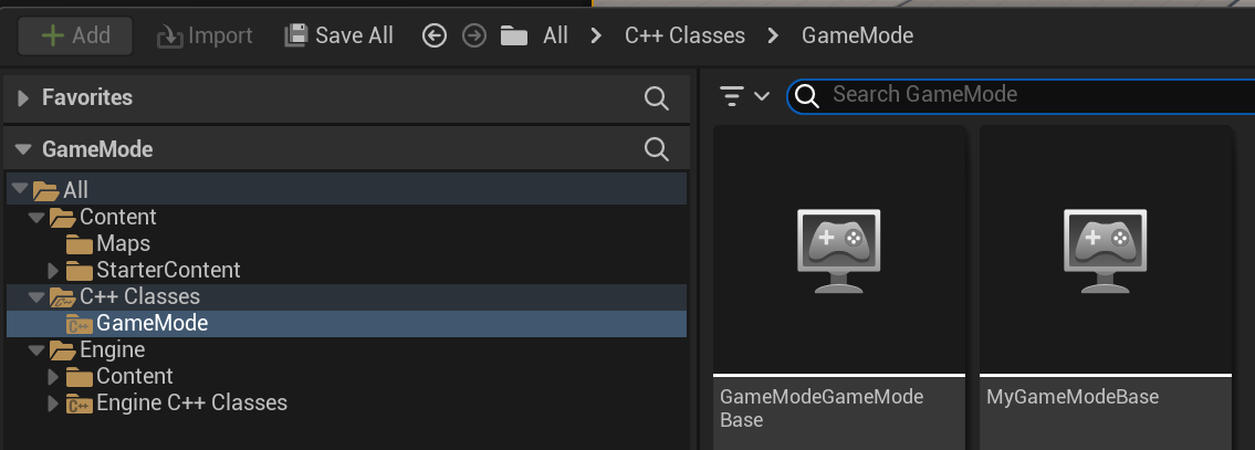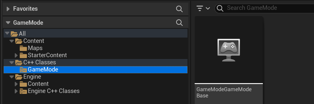 다시 언리얼로 돌아와 라이브코딩을 해준다. 정상적으로 수행하면 GameMode폴더에 방금만든 MyGameModeBase가 보인다.