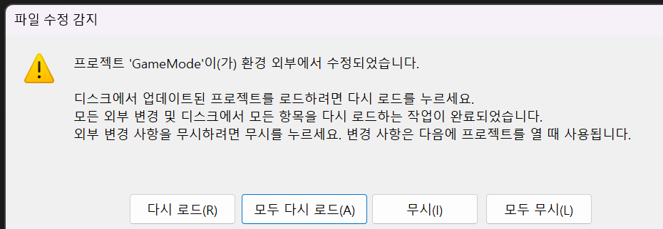 저장후 컴파일에러가 나는데 Visual Studio 로 가서 모드 다시로드를 눌러준다.