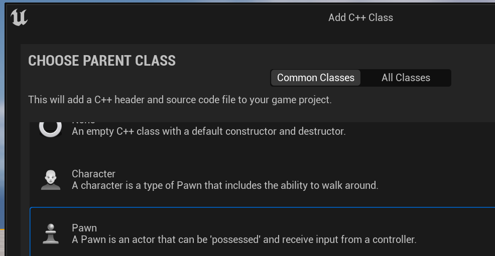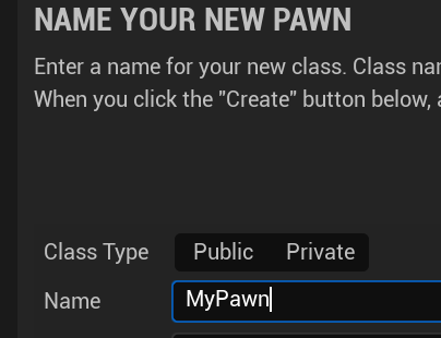 C++Classe>GameMode폴더에 우클릭후 C++클래스를 클릭후 부모로 Pawn을 선택후 이름을 MyPawn으로 한다.