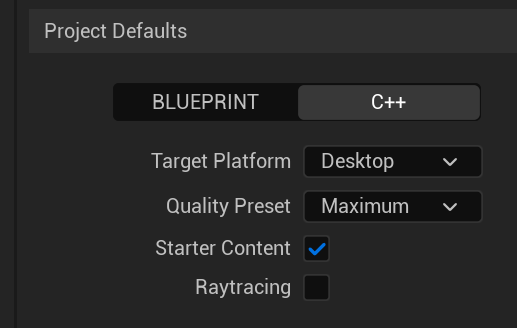 프로젝트 디테일은 C++로 하고 Starter Content를 포함시킵니다. 이름을 GameMode로 하고 Create합니다.