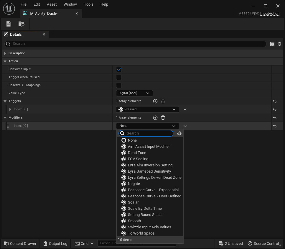 최하위 레벨에는 각 사용자 입력에 대한 입력 트리거와 입력 모디파이어 목록이 포함되어 있습니다. 이를 사용하여 입력 원시 값의 필터링 방식이나 처리 방식, 그리고 최상위 계층구조에서 입력 액션을 구동하기 위해 충족해야 하는 제한 사항을 결정할 수 있습니다.