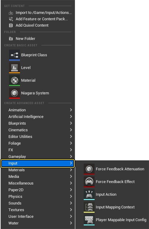 향상된 입력은 기본적으로 활성화됩니다. 콘텐츠 브라우저에서 추가 (+ )를 클릭하고 입력(Input) 카테고리로 이동하여 입력 에셋을 생성할 수 있습니다.