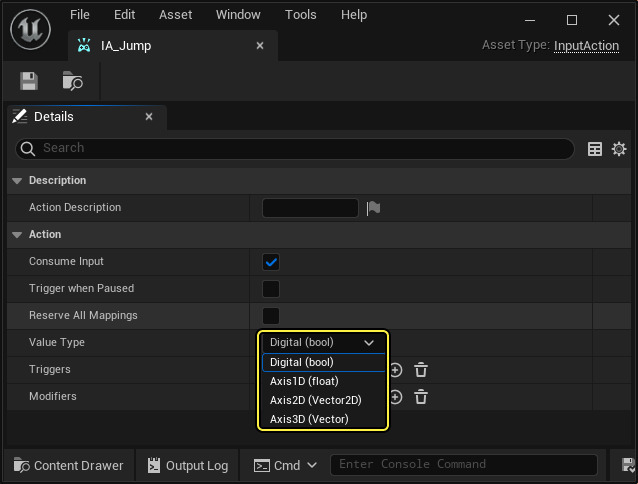 입력 액션은 여러 타입이 될 수 있으며, 타입에 따라 액션의 동작이 결정됩니다. 단순한 부울 액션을 만들 수도 있고 더욱 복잡한 3D 축을 만들 수도 있습니다. 액션 타입이 그 값을 결정합니다. 부울 액션은 단순한 bool 값을 갖고, Axis1D 는 float 값을, Axis2D 는 FVector2D , 그리고 Axis3D 는 전부 FVector 입니다.