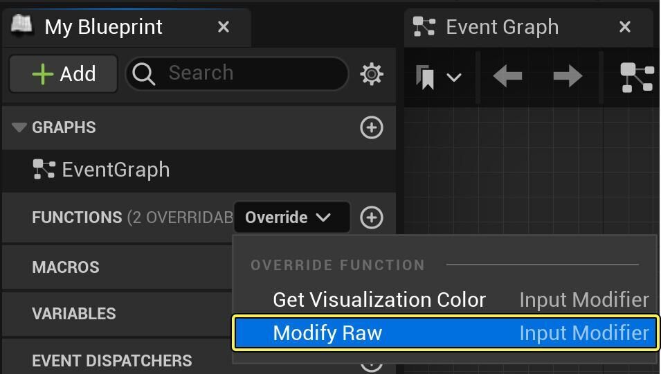 다음으로 내 블루프린트(My Blueprint) > 함수(Functions) > 오버라이드(Override) 의 드롭다운 메뉴 에서 Modify Raw 함수를 선택합니다.