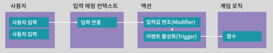 이벤트 활성화(Trigger) : 들어온 입력이 일반 버튼인지, 축 이동인지, 일정 이상 눌러야 하는지 등을 확인하여 이벤트를 활성화 시키고, 게임 로직의 Input 함수로 호출합니다.