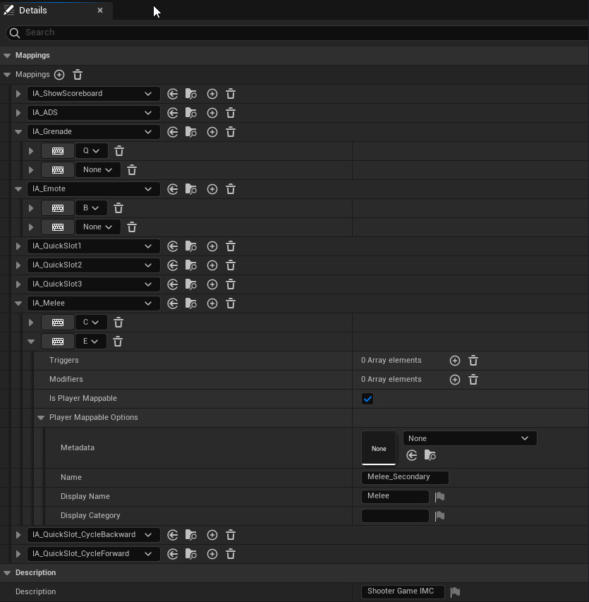 여기에서 입력 액션 바인딩에 대한 실제 키를 구현하고 각 액션에 대한 추가 트리거 또는 모디파이어를 지정합니다. 향상된 입력 서브시스템에 입력 매핑 컨텍스트를 추가할 때 우선순위를 지정할 수도 있습니다. 같은 입력 액션에 여러 컨텍스트를 매핑한 경우, 입력 액션이 트리거되면 가장 우선순위가 높은 컨텍스트가 고려되고 다른 컨텍스트는 무시됩니다.