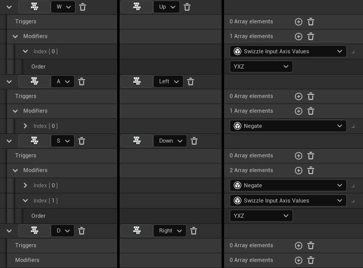 각 키가 양의 1차원 값을 보고하기 때문에, 이 값은 항상 X축을 차지하고 모든 주어진 틱에서 0.0이나 1.0 값을 갖게 됩니다. 왼쪽과 아래쪽 입력 값을 무효화하고 입력의 X축 값이 위쪽과 아래쪽 입력의 Y축으로 이동하도록 축 순서를 전환하면 입력 모디파이어를 사용하여 1차원 입력 세트를 하나의 2차원 입력 값으로 해석할 수 있습니다.
