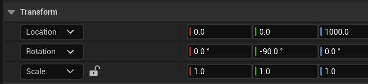 컴파일후 뷰포트로 드래그해서 배치한후 로테이션 Y 를 -90으로 해서 아래로 발사하게 해줍니다.
