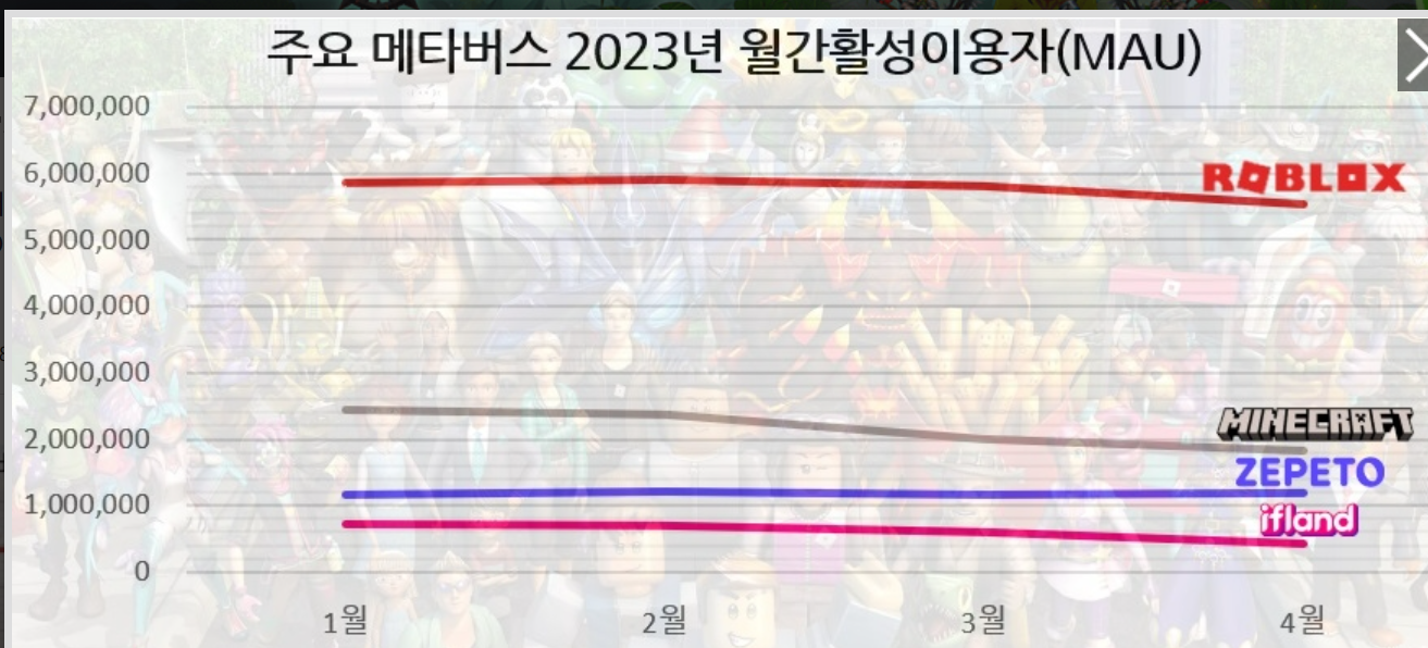 앱 통계 분석 플랫폼 '데이터ai'에 따르면 제페토와 이프랜드의 국내 양대 앱 마켓(구글 플레이스토어·애플 앱스토어) 월간 활성 이용자는 각각 4월 기준 119만명, 42만명으로 집계됐다. 같은 기간 '로블록스'의 MAU는 553만명으로 제페토의 5배에 가까웠다.