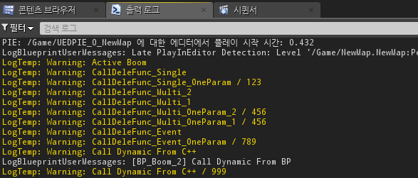 폭탄이 터지고 로그를 확인하면 블루프린트에서 바인드한 Custom함수와, C++에서 바인드한 함수가 동시에 호출되는 것을 확인 할 수 있습니다.