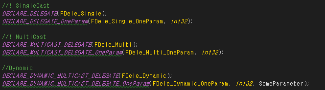 DECLARE_DELEGATE는 인자 값 없는 함수에 사용하고 DECLARE_DELEGATE_OneParam는 1개의 인자값이 있는 함수에 사용합니다, 만약 인자 값이 2개면 TwoParam을 사용합니다.