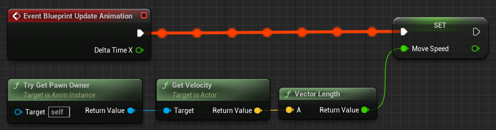 블루프린트에서 moveSpeed를 얻어옴 Character의 Get Velocity를 이용해서 Scala값으로 변환후 설정