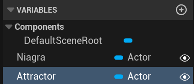 NS_Attractor는 나이아그라 FX이고 BP_NiagraAttractor는 타겟 액터의 위치를 나이아그라 FX에 전달해주는 역활을 한다. BP_NiagraAttractor 를 아웃라이너에서 레벨상의 액터를 선택해 변수에 설정해준다. 되도록 FX와 가까운 액터를 설정해준다