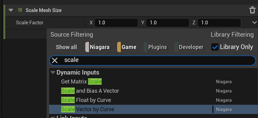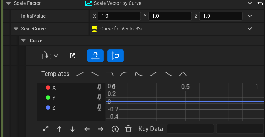 Scale Factor오른쪽을 펼쳐 Scale vector by Curve를 선택해 X Y Z 커브를 바꾸면 메시의 생성주기의 사이즈를 변경할수도 있지만 이번에는 사용하지 않습니다.