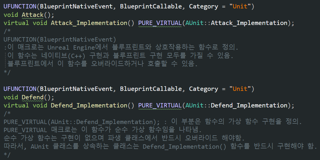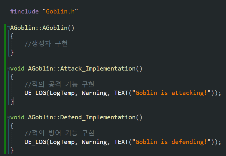 - 확장성 및 유연성: 새로운 유닛이나 적 종류를 추가(신규 콘텐츠 추가)할 때 기존 코드를 수정하지 않고 새로운 클래스를 추가하여 확장할 수 있습니다. 예를 들어, 새로운 적(예: Orc)을 추가하려면 Orc 클래스를 만들고 AEnemy를 상속하여 구현만 하면 됩니다.
