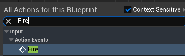 BP_Player블루프린트를 열어 이벤트그래프의 빈곳에 우클릭후 Fire를 입력해서 추가한다. InputActionFire로 찾을수 없다.