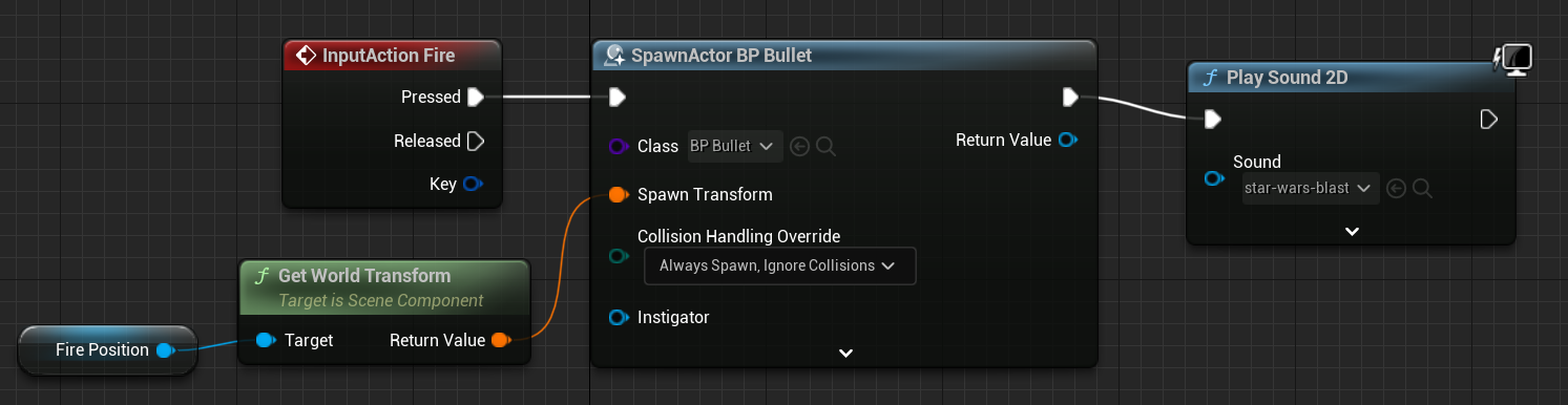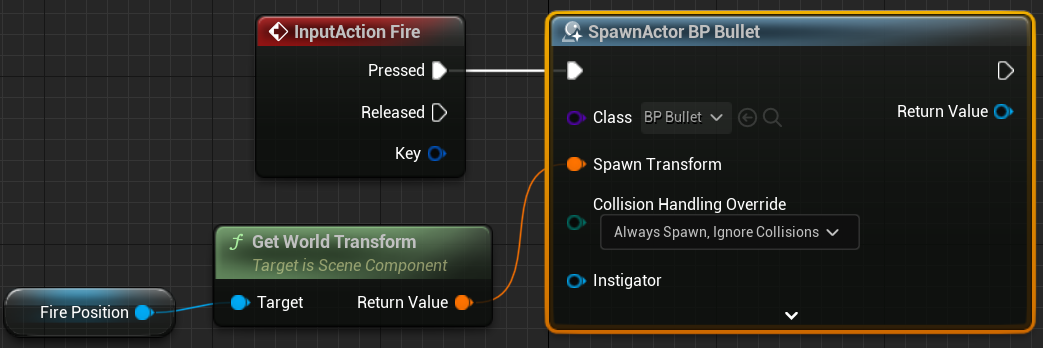이벤트그래프에서 우클릭후 world trnas를 입력해서 Set World Trnasform (FirePosition)을 클릭해서 노드가 추가되면 Spawn Trnasform핀에 연결해준다.