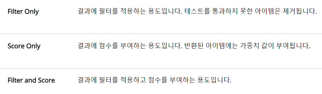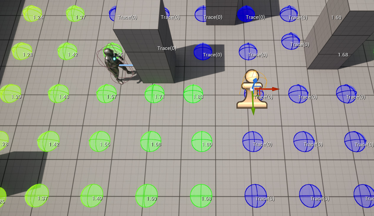 파란색 구체 : 이 구체는 해당 아이템의 테스트가 실패했음을 나타냅니다. 따라서 아이템은 아무런 가중치가 적용되지 않고 결과에서 제외됩니다. 보통 값이 필터로 걸러졌을 때 발생합니다. Distance 테스트 등으로 모든 아이템이 필터 범위를 초과하거나 필터 범위 미만일 때와 같은 경우입니다. 값이 완전히 제외되기를 원하지 않는다면 점수화 섹션의 범위제한(Clamp) 옵션을 사용하면 됩니다.