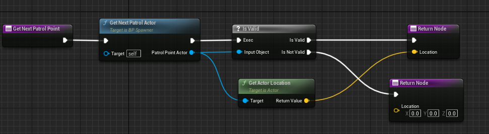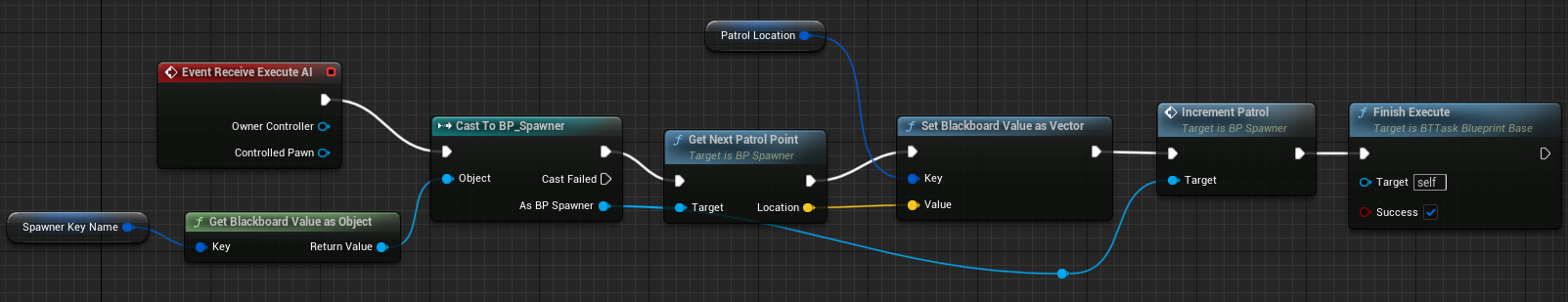 8. Spawn된 Character가 돌아다니기 위한 PatrolPoint를 얻기위해 레벨에 위치한 패트롤포인트를 얻어야하는데 Spawn하기 때문에 Replicate에서 연결하기가 귀찮았다. 따라서 BP_Spawner에 미리 위치를 얻어 저장하고 이걸 블랙보드에 지정하고 이걸 Player가 불러다 쓸 예정이다. Interface를 사용하면 편할줄 알았는데 비헤이버트리는 Pawn정보를 얻어오기 때문에 힘들었다. AI Controller에 저장해놔도 편할것 은 같다.